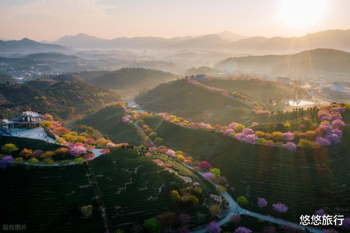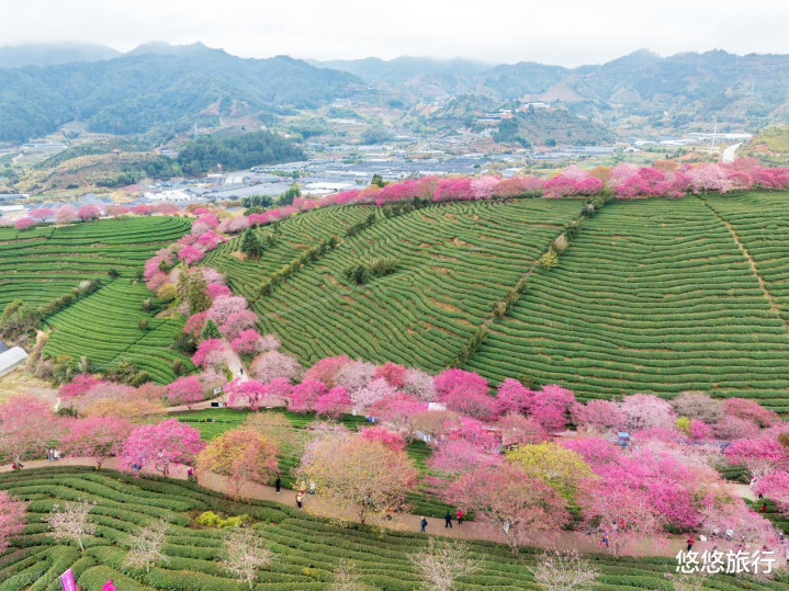 从高处俯瞰,层层叠叠的茶园与粉粉嫩嫩的樱花相互交织。蜿蜒的小路穿梭其中的画面,非常有意境。