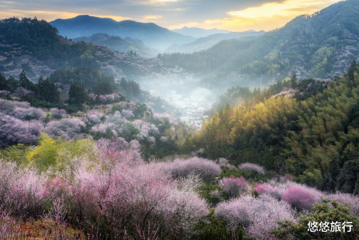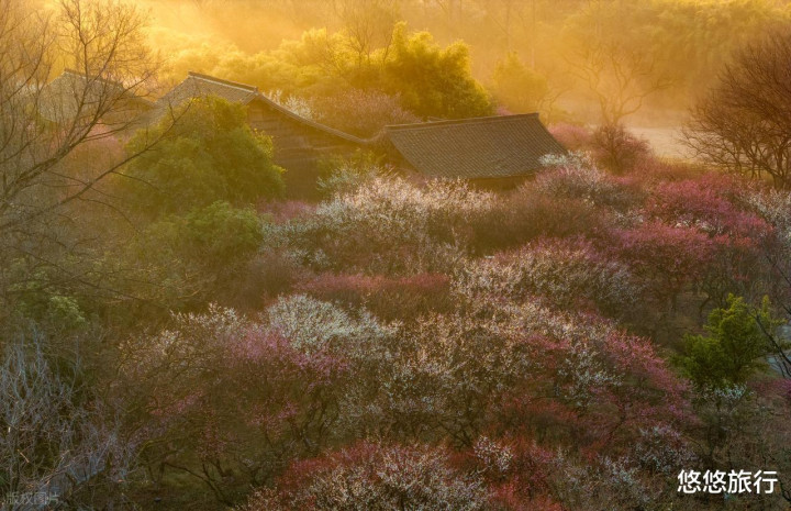 2月中旬,村子周围的山腰至山顶层层叠叠的野生梅林,粉白交织如云霞。