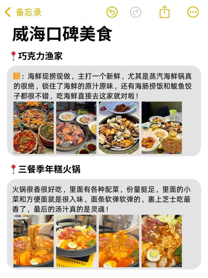在威海我们吃了好多美食,推荐🍫巧克力渔家和🍲三餐季年糕火锅,巧克力渔家主要是做海鲜🦐的,蒸汽海鲜一下能吃到好多种海鲜,而且味道真的很不错👍🏻,三餐季年糕火锅是韩餐的那种,很正宗很好吃😋