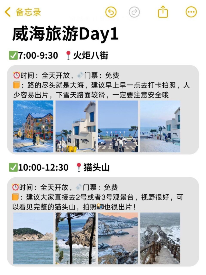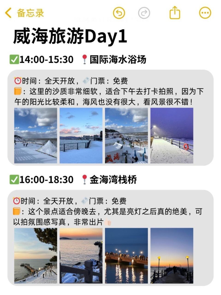 冬天来威海一定要💡穿厚点,手套🧤帽子🧢都是必备的,手机贴暖贴防冻关机,威海下雪很冷的❄️🐟订酒店之前🏘️要先确认有没有暖气,冷的话也可以问老板多要被子。🦞吃完海鲜别马上吃冰的,特别是肠胃敏感的,亚搏app官网可以备点常用药。📸雪后上午10点前、下午3点后拍照好看。✈️威海大水泊机场,离市区约40分钟车程适合远途的宝,机场大巴或🚗打车到市区都很方便!