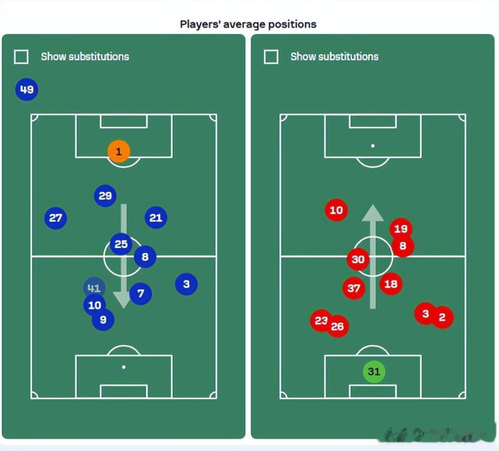 昭着,卡里克是吸取了训戒的。先给你看一下上半场的平均站位图,你会很显著发现,赛斯克+B费出当今梅努+卡塞米罗的身前,曼联再次形成了梯形的中场结构,而两个边后卫减少了压上的频次,专心拼集切尔西的边锋,曼联主打领路中路、边后卫单防边锋的肃肃反击体系。