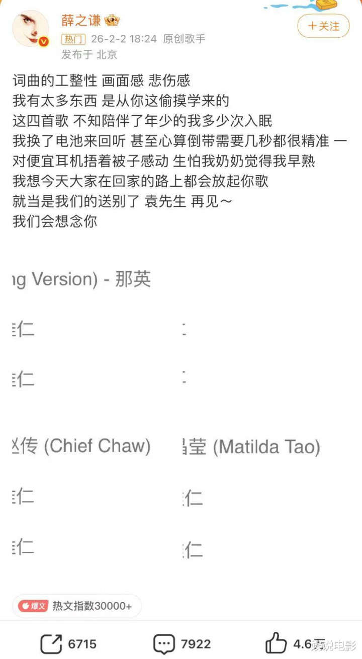 那英悼念袁惟仁,谢谢他带来这么多美好的音乐,在另一个世界也要继续弹着吉他唱着歌。小胖,一路走好!