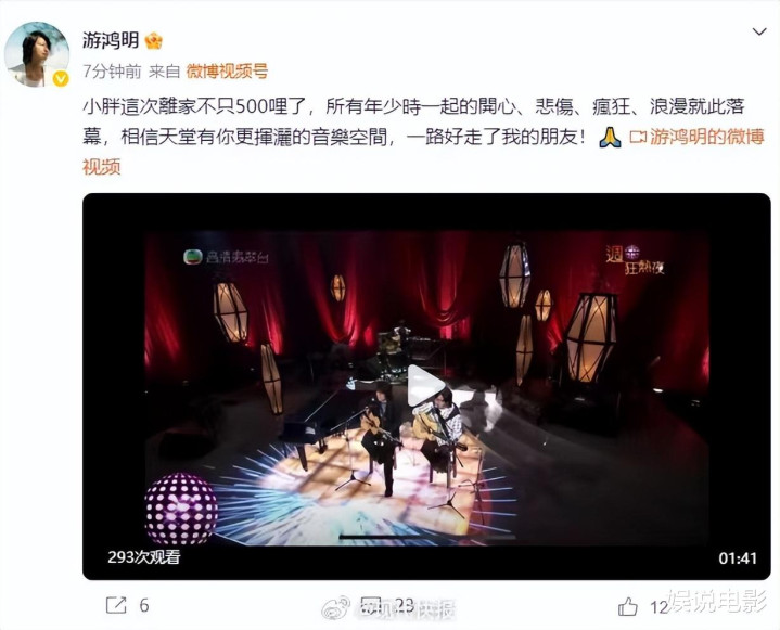 歌手游鸿明表示,小胖这次离家不只500里了,所有年少时一起的开心、悲伤、疯狂、浪漫就此落幕,相信天堂有他挥洒的音乐空间,一路走好他的朋友。