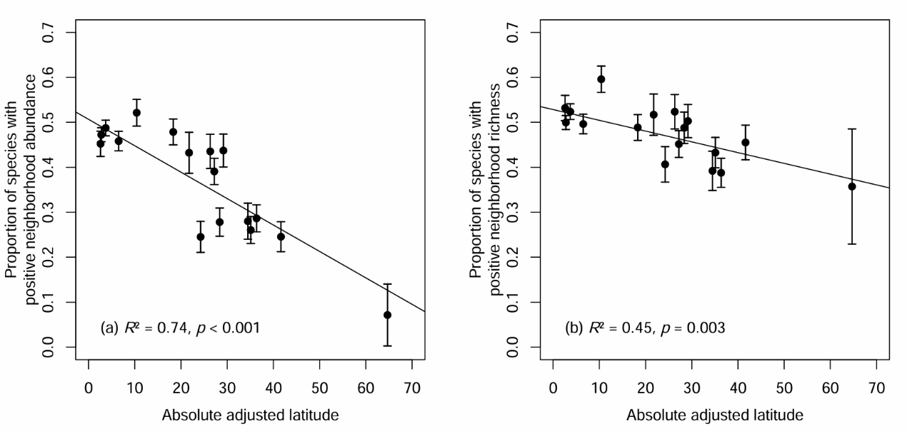 图3 在群众17个丛林大样地中,促进物种数目比例随纬度升高而缩小。基于(a)物种多度和(b)物种丰富度,评估促进物种对邻体物种的相对影响。