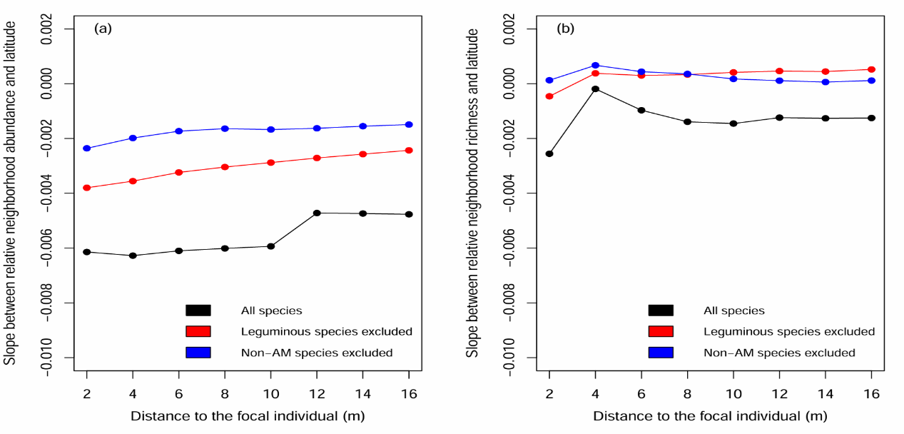 图4 分辨摒除豆科物种和非丛枝菌根树种后,17个丛林样地相对邻体相互作用与纬度之间关系关系的斜率变化。(a)基于物种多度的邻体相互作用(b)基于物种丰富度的邻体相互作用