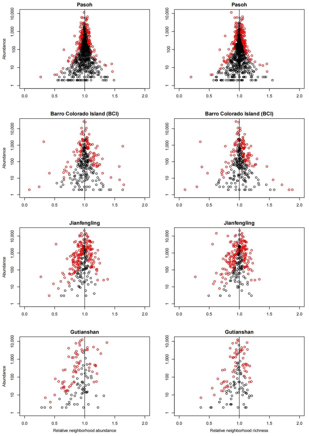 图2 4个典型样地物种多度与相对邻体多度和相对邻体丰富度之间的关系