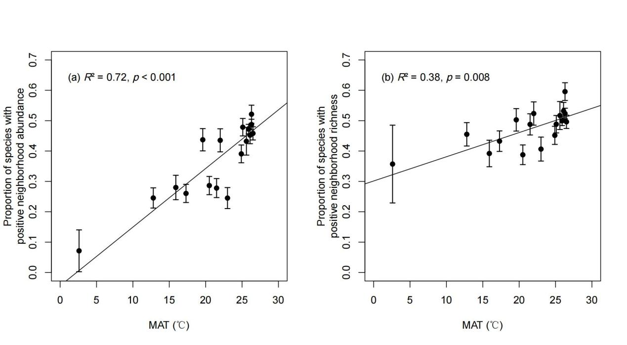 图5 17个丛林样地中具有正(a)邻体物种多度和(b)邻体物种丰富度的物种比例跟着年平均温度变化的关系