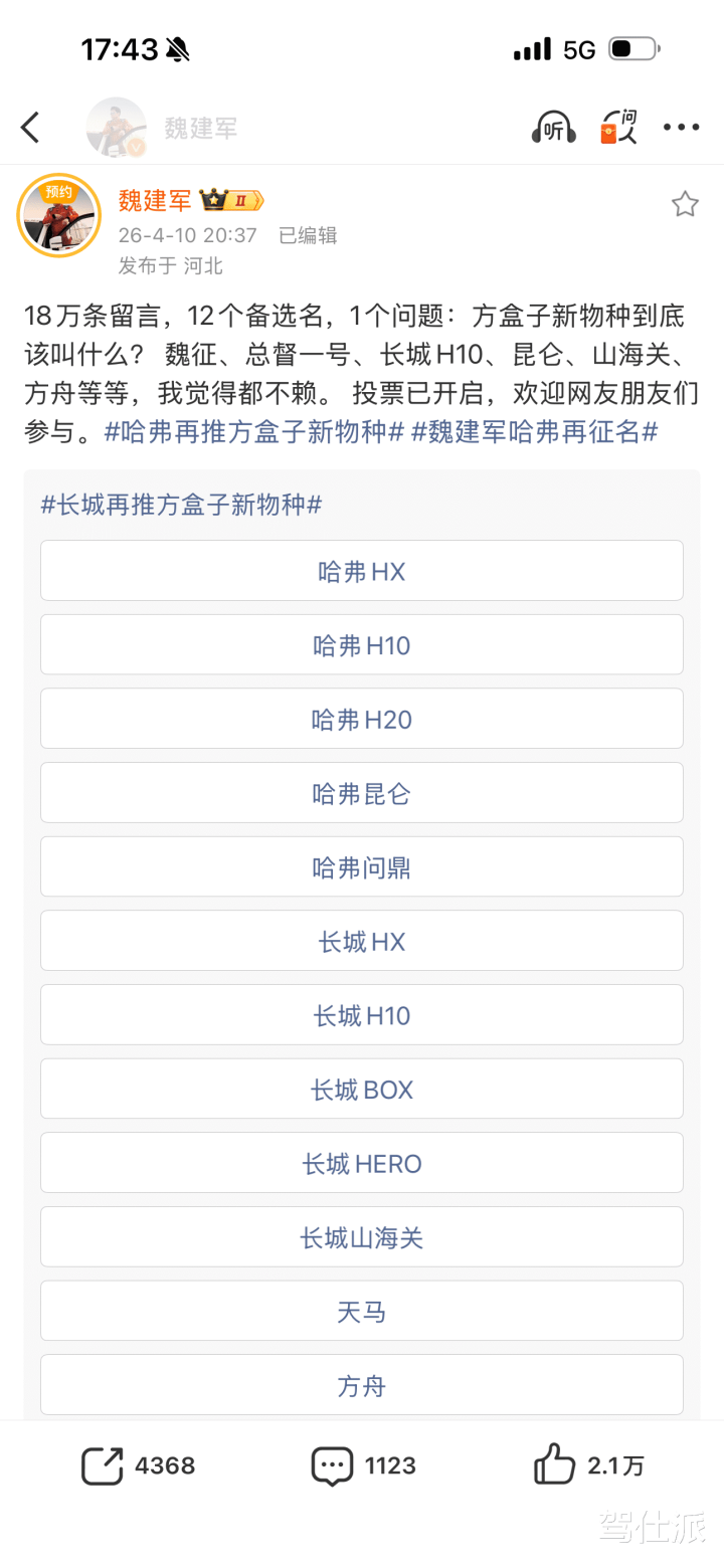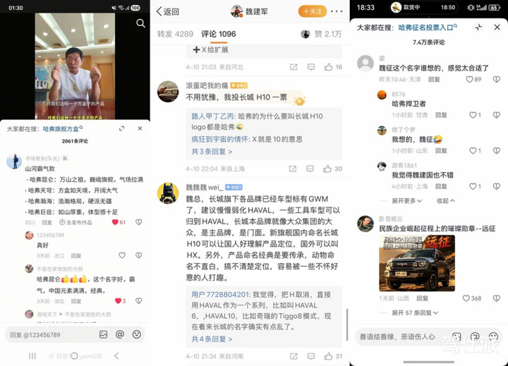 从挑剔区看,既有复古“长城H10”、“哈弗H10”等传统定名的,也有网友建议叫“昆仑”“山海关”“问鼎”“方舟”等中国风名字,以致还有网友玩梗建议“魏征”,因为魏建军老在征名,用户参与互动的温情极度高。
