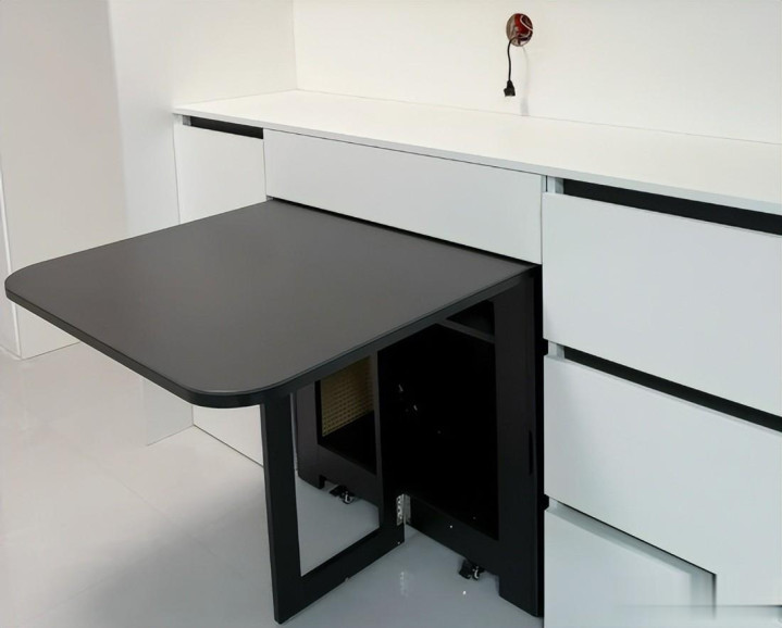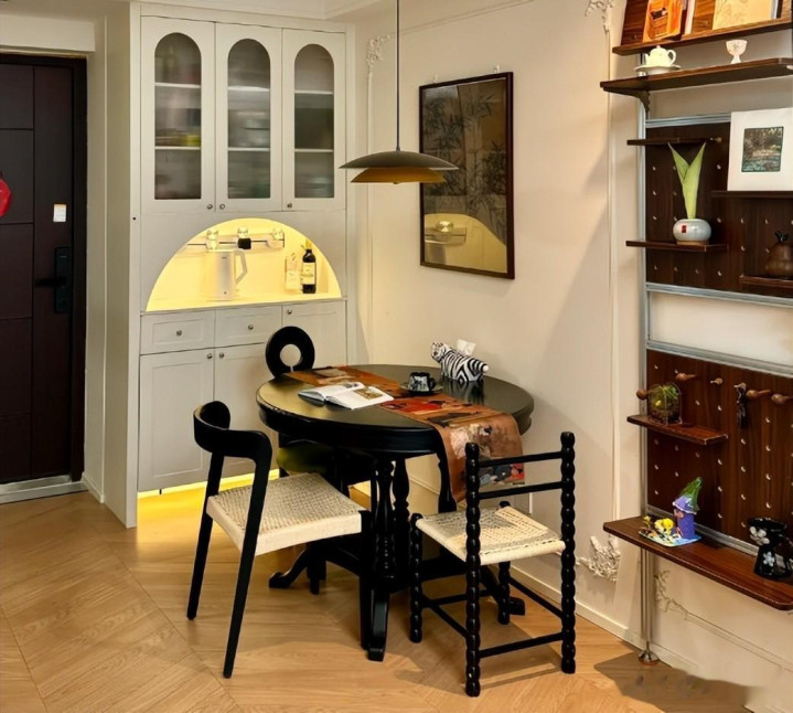 有条件的还可以去设计一个餐边柜,把折叠餐桌折叠后嵌入到下方位置,不影响任何动线。