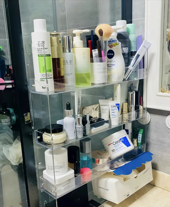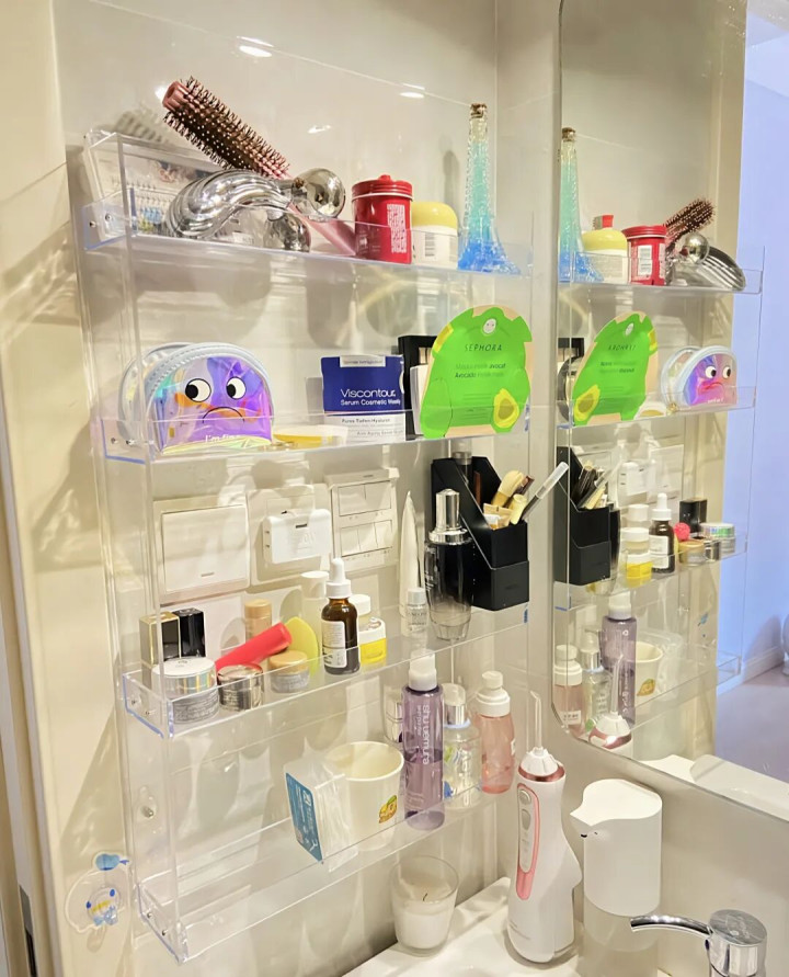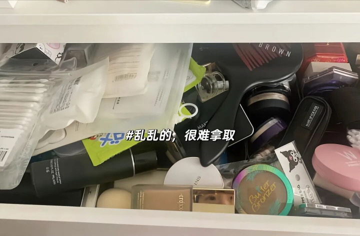比如说卫生间的化妆品,满台面乱七八糟地摆着,简直让人心情瞬间掉到谷底。