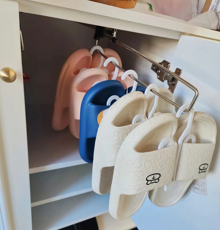 有网友把超市那种挂拖鞋的挂架带回了家,再加上一个抽拉滑轨,立马就搞定了一个既方便又省空间的拖鞋收纳架。大人小孩的拖鞋、平底鞋都能轻松挂上,拿取方便不说,还能让鞋柜变得整洁有序。