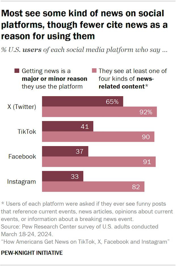 根据皮尤研究所的一份报告,大多数X用户表示,获取新闻资讯是他们使用该平台的主要或次要原因,约有一半的用户表示,他们经常在X上获取新闻。