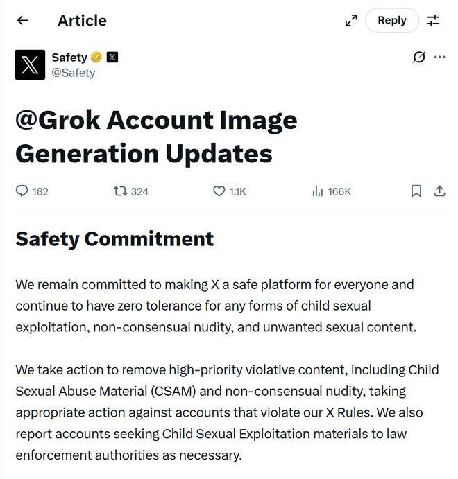 逼得X不得不站出来,宣布采取措施制止Grok生成色情图像。