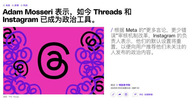 根据外媒报道,Instagram的一把手AdamMosseri在Threads上线之初就摊牌过,他们的目标是打造一个“更少愤怒的对话场所”,不鼓励政治或者硬新闻内容。