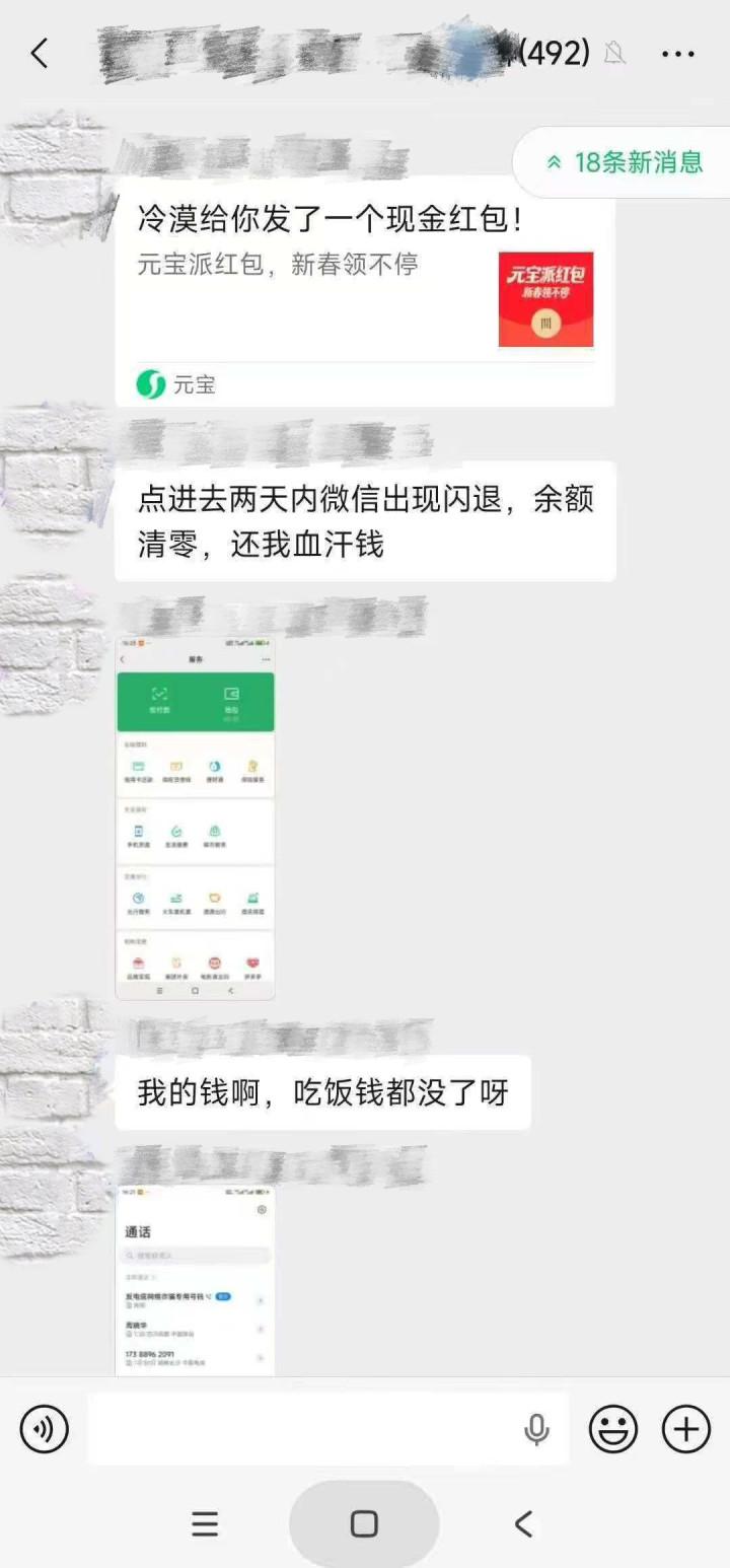 2月2日,一则网传的微信群聊图片显示,有病毒虚假链接伪装成元宝红包形式出现,诱导用户点进后致微信闪退,有用户余额因此清零,引发公众对于财产安全方面的担忧。