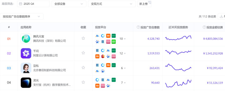 据AppGrowing估算,元宝在2025年投流最高,达到了150亿元,且下半年的力度明显拉高,合计105亿元,仅三季度就有57亿元;千问以全年18亿元位列第二,并从第四季度开始追高,单季度投入15亿元;相比之下,豆包全年仅投流4亿元。