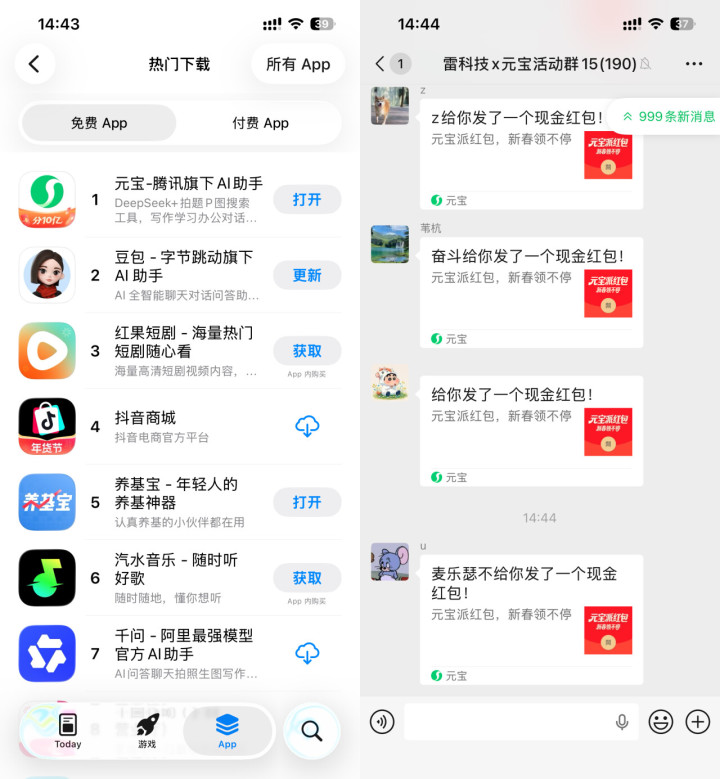 不过,其他大厂也没闲着。还记得前两天上线的腾讯元宝分 10 亿春节红包不?整得那叫一个全网轰动啊。小雷每天两眼一睁,看到的不是微信好友发来的消息,而是群友那一条又一条的“xxx给你发了一个现金红包”。就这架势,堪比当年拼多多的砍一刀了。但不得不承认的是,这波流量赚到了,元宝 APP 的下载量也暴增。