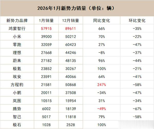 CNMO注意到,kaiyun体育app潘九堂还转发了一份2026年1月新势力销量榜单。数据显示,小米汽车1月销量为39000辆,12月销量为50212辆,亚搏环比下降22%。值得注意的是,其余新势力品牌在该月销量也均有不同程度的环比下滑,这进一步印证了淡季对市场整体的影响。