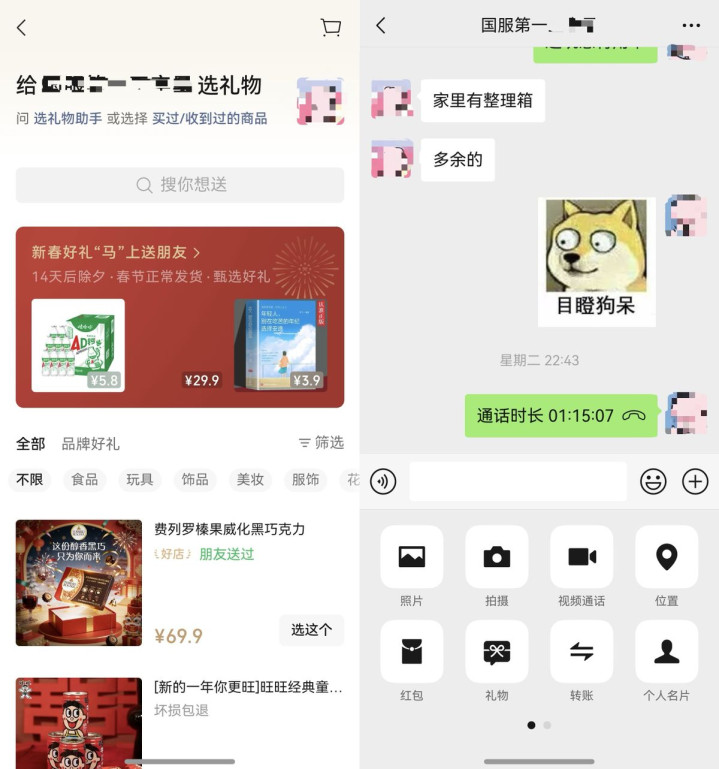 首先,我觉得最有年味的新功能,就是支持用户之间收发礼物。打开聊天界面底部的“+”,你就会发现多了一个“礼物”选项,可以给家人朋友送出一份礼物,让心意的表达更有仪式感。