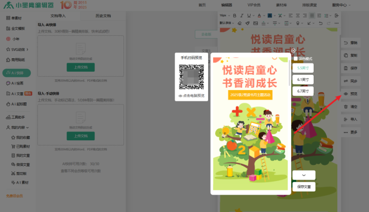 1. 预览检查:点击「预览」按钮,同步查看文章在手机、电脑端的实际显示效果,及时修正格式错乱、素材异常等小问题;