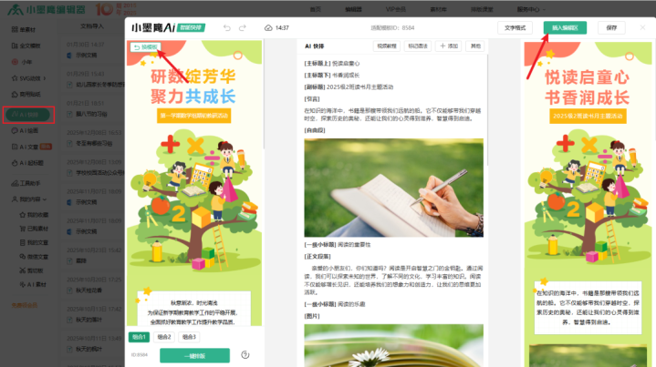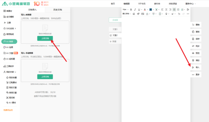 - 导入已有文档:若已在Word等软件写好文章,无需手动搬运,点击编辑区右侧「导入」按钮,或左侧「AI快排」-「导入-AI快排」,一键上传文档,内容会完整导入,大幅节省时间。