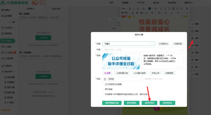 2. 同步发布:确认无误后,点击「保存-保存并同步」,将文章直接同步至微信公众号后台;