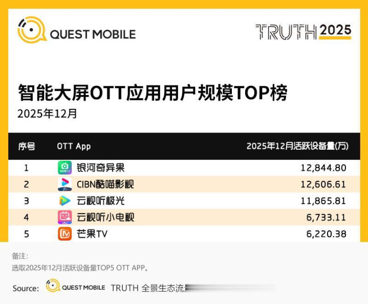 {jz:field.toptypename/}小程序之外,智能电视为代表的硬件生态,已经成为“场景化流量中枢”,例如,智能电视终端设备月活数量已经达到2.89亿台,终端内的应用方面,银河奇异果、CIBN酷喵影视、云视听极光、云视听小电视、芒果TV月活设备分别达到了1.28亿台、1.26亿台、1.19亿台、0.67亿台、0.62亿台。