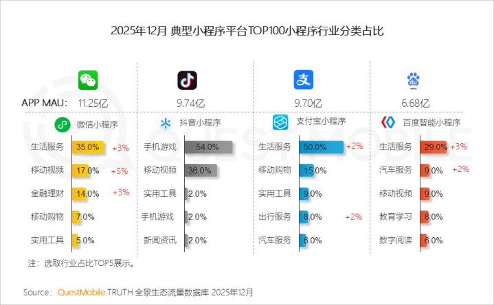 生活服务成为微信、支付宝及百度智能小程序的核心场景,并持续增强;短剧的流行进一步推动了微信与抖音生态中视频类小程序的繁荣发展。