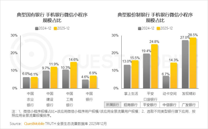 相较于国有大行的稳步跟进,股份制银行在小程序生态布局更加积极,尤其信用卡服务领域,部分微信小程序流量占比已超20%。