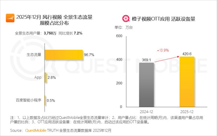 2.3 风行视频以生态流量为主导,旗下橙子视频OTT应用活跃设备量稳步增长