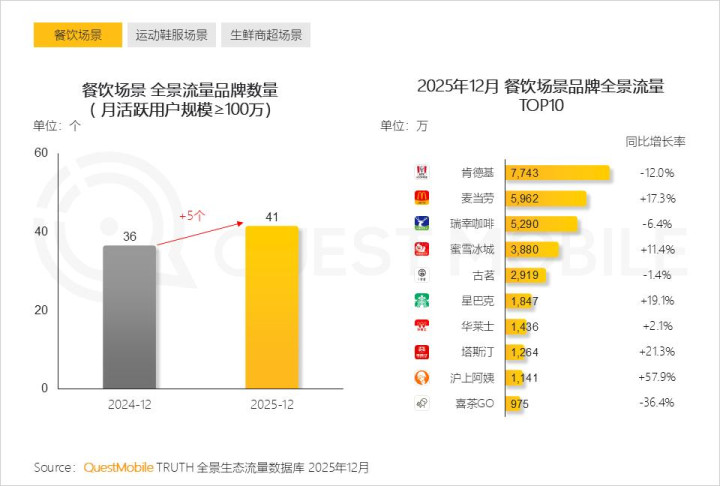 1、餐饮品牌全景流量持续扩容,百万月活跃用户规模以上品牌数量超40个;新式茶饮及快餐品牌流量占据前列,沪上阿姨、塔斯汀、星巴克等品牌增速亮眼