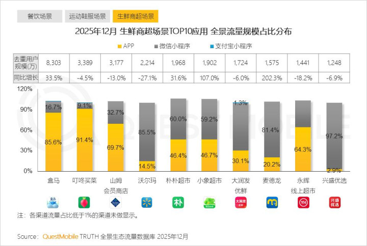 4、即时零售需求促使生鲜商超企业加快数字化步伐, “APP+小程序”双轮并进,TOP10应用全景流量均超千万