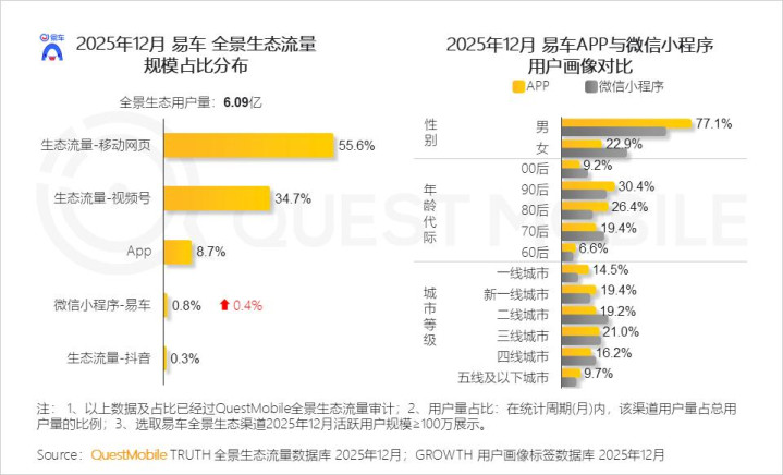 QuestMobile数据显示,易车微信小程序渠道流量占比从去年同期的0.4%提升至0.8%,相较于APP用户,其微信小程序在女性及下沉市场用户结构更为突出。