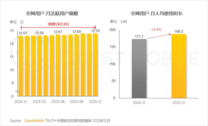 QuestMobile数据显示,2025年12月,全网月活跃用户规模已达12.76亿,用户月人均使用时长达186.2小时,同比提升8.4%。