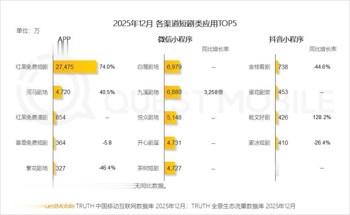 微信平台中,白鹭剧场、九溪剧场、悦众剧场、开心剧屋、茶树短剧等小程序月活用户规模分别达到6979万、6880万、5148万、4731万、4727万;抖音平台中,金枝看剧、蛋花剧堂、载文好剧月活用户规模分别达到738万、453万、426万……