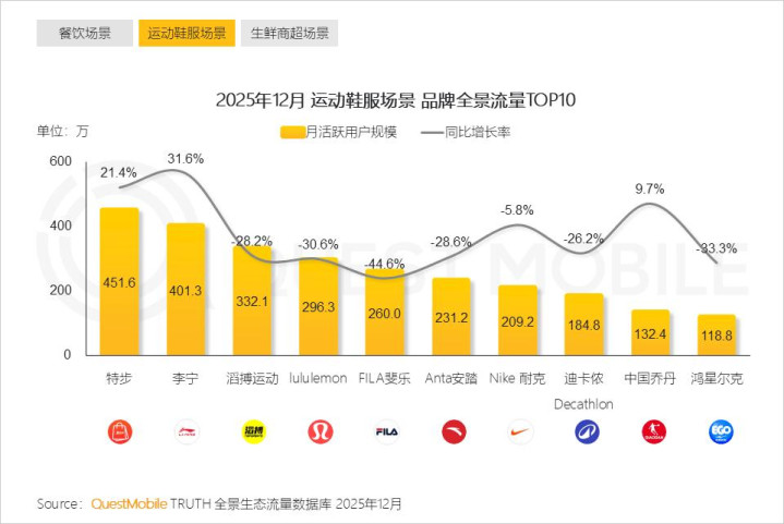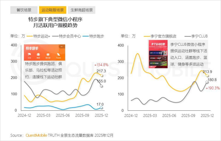 运动品牌通过微信小程序矩阵提供购物、会员服务、活动社群运营等多样化服务,QuestMobile数据显示,2025年12月,特步与李宁旗下微信小程序特步运动+、李宁CLUB,月活跃用户规模分别达到217.3万、180.8万,同比增长134.8%、190.3%。