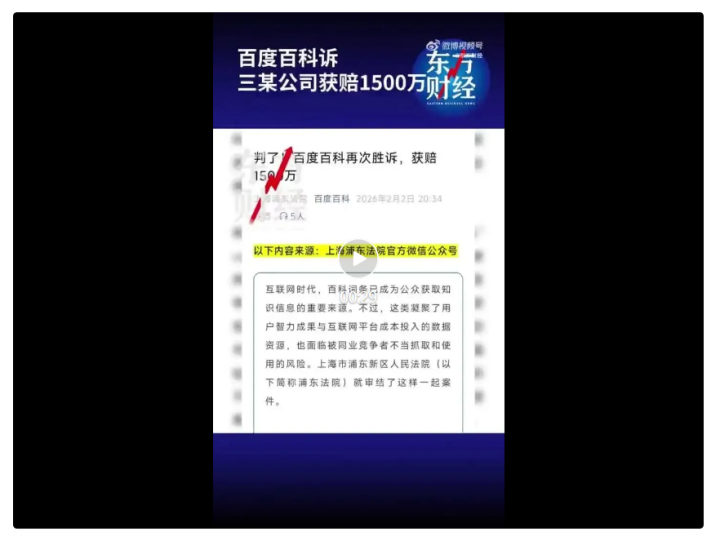 据东方财经:2月2日,百度百科公众号转发上海市浦东法院《百科词条遭同业竞争者抓取使用,法院判赔1500万》一文。