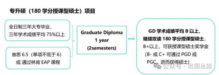 关于中国的专科学生(三年全日制),林肯大学提供了一年制的大学学士后证书(Graduate Diploma)课程。完成此课程后,收成平均B以上,就不错恳求有关限制的讲课式硕士课程,总学分180分。