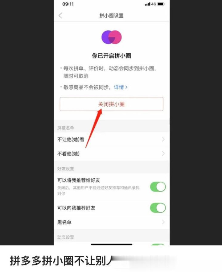 关闭完这两个开关后,然后再向上滑关闭这个拼小圈,直接关闭,这样拼小圈的功能就完全关闭了。咱们再买什么东西的时候,你的好友就不会看见了。