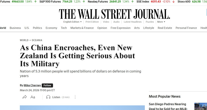《华尔街日报》在这篇名为“跟着中国的推广,以至新西兰也开动崇拜对待其军事问题”的著作中涌现: