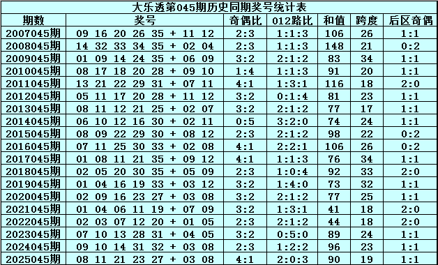 后分辨析:在第045期历史同时开奖中,后区奖号一奇一偶出现12次,全奇出现4次,全偶出现3次,本年第045期后区瞻望出现一奇一偶组合,看好两码07和12。