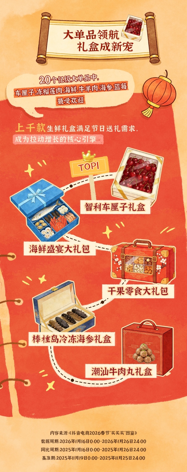 数据显示,1月16日至1月26日,抖音电商鲜食品类销售迎来全面爆发,不同细分赛道基于用户消费需求变化呈现差异化增长态势。在20个亿级大单品中,车厘子、冻榴莲肉、海鲜礼盒、牛羊肉、海参和蓝莓最受欢迎;上千款生鲜礼盒精准击中节日送礼需求,成为拉动增长的核心引擎。