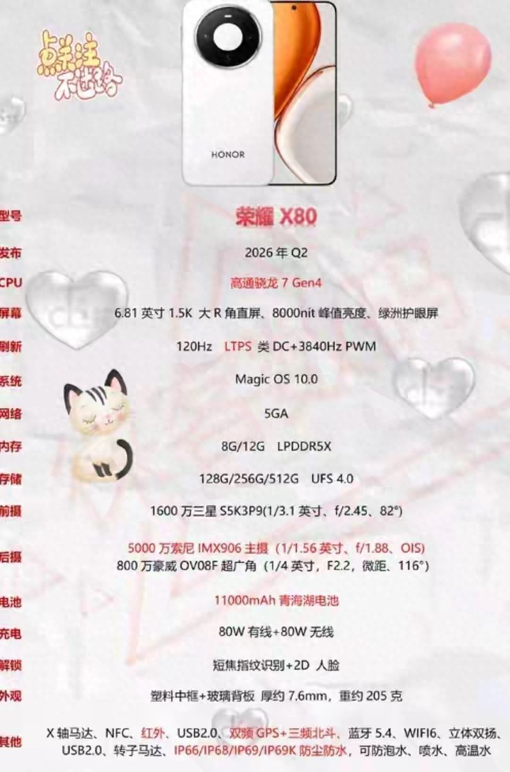 参考荣耀X系列的历史定价,X60的起售价为1599元,X80在电池容量和处理器上有明显升级,预计起售价会在1799-1999元区间,这个价格对于追求续航的用户来说,性价比极高。随着配置的逐步曝光,发布时间也越来越近,不出意外的话,它会在2026年Q2正式登场,瞄准五一换机潮。