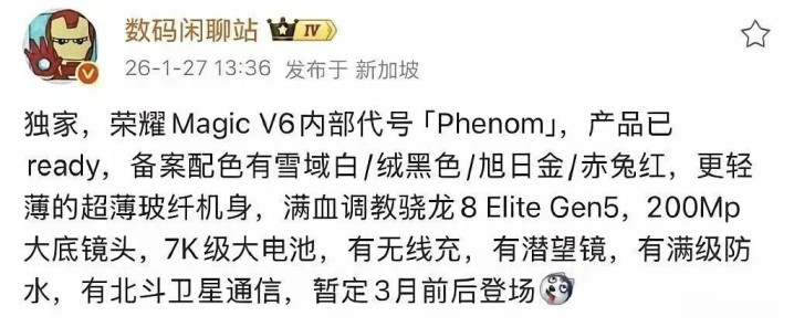 在具体配置上,Magic V6将配备2亿像素主摄,并有消息称其潜望式长焦镜头同样达到2亿像素,支持3倍光学变焦。这样的影像配置在折叠屏领域堪称顶级。