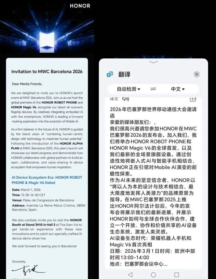 更值得关注的是,荣耀此次采取双旗舰策略,除了Magic V6外,还将同步推出业界首款机器人手机ROBOT PHONE。