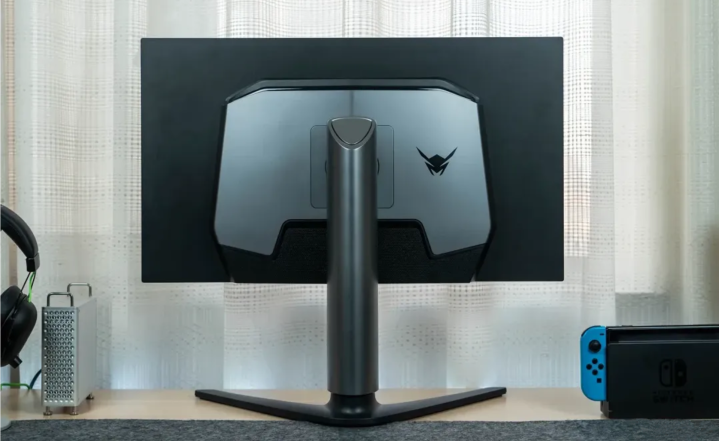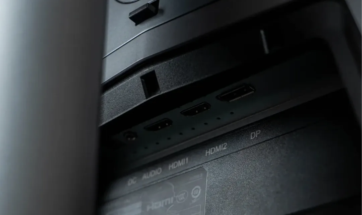 接口方面,从左往右依次为:电源接口、3.5mm音频接口、2xHDMI 2.1接口、DP 1.4a接口。其中,HDMI 2.1提供48Gbps满血带宽,可以完美支持PlayStation 5和Xbox Series X等游戏主机,略有不足的是没有配备USB拓展接口。 为了让背部的在整体观感更统一,设计师在接口处设计了一块挡板,平时也兼职了理线功能。没错,显示器支架竟然没有预留理线孔。
