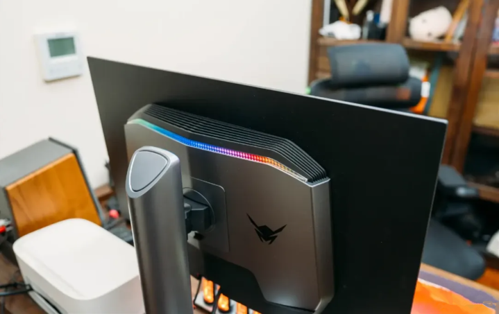蚂蚁电竞ANT272ZQE的外观设计给我的第一印象是硬朗、有质感。显示器的背部设计简约、造型立体,虽然是塑料材质,但做出了磨砂金属的质感,散发出一股凌厉的电竞气息。 顶部是显示器的散热出风口,在出风口的旁边别出心裁的设计了一条曲线形灯带,可以在OSD菜单-游戏模式-氛围灯里切换不同的灯光效果。