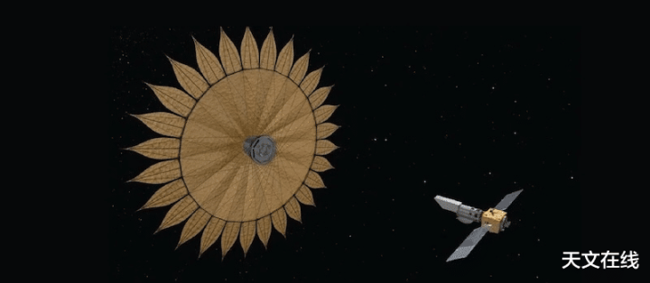 这是一种访佛的星盾成见,即在空间千里镜前线部署一个大型星盾,用于掩盖方针恒星发出的强光。图片来自好意思国国度航空航天局(NASA)。