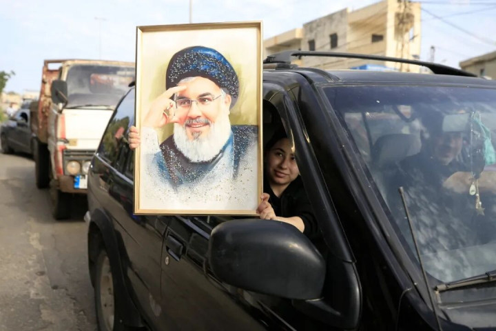 2026年4月17日,在黎巴嫩南部加西米耶,群众在停战收效后举着已故真主党指点东说念主纳斯鲁拉的画像复返家园。新华社发(阿里·哈希绍摄)